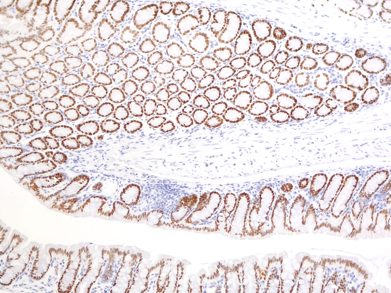 Beyond its pivotal role in neurodevelopment, SATB2 is also expressed in non-neuronal tissues, notably in the epithelium of the lower gastrointestinal tract, including the colon. In normal physiology, it is strongly expressed in glandular cells of the colorectal mucosa. In pathology, SATB2 serves as a highly sensitive and specific immunohistochemical marker for colorectal epithelial differentiation and is expressed in the majority of primary and metastatic colorectal adenocarcinomas (5, 6). This colonic expression pattern makes SATB2 a valuable diagnostic biomarker in surgical pathology, particularly in determining the origin of metastatic lesions.
